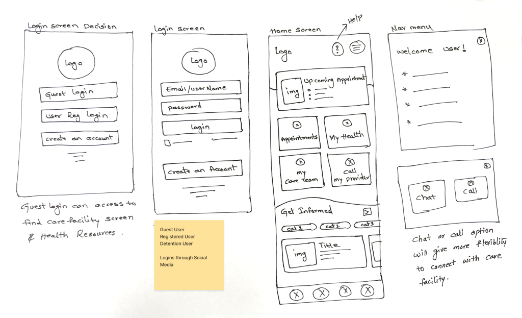 For Ygetit, early sketches helped visualize core features like the Geo locator, Appointments, and AI chat companion, ensuring the app remained intuitive and user-centered. These low-fidelity visuals encouraged open feedback, enabled rapid iteration, and clarified the app’s structure laying a strong foundation for wireframes and user testing.