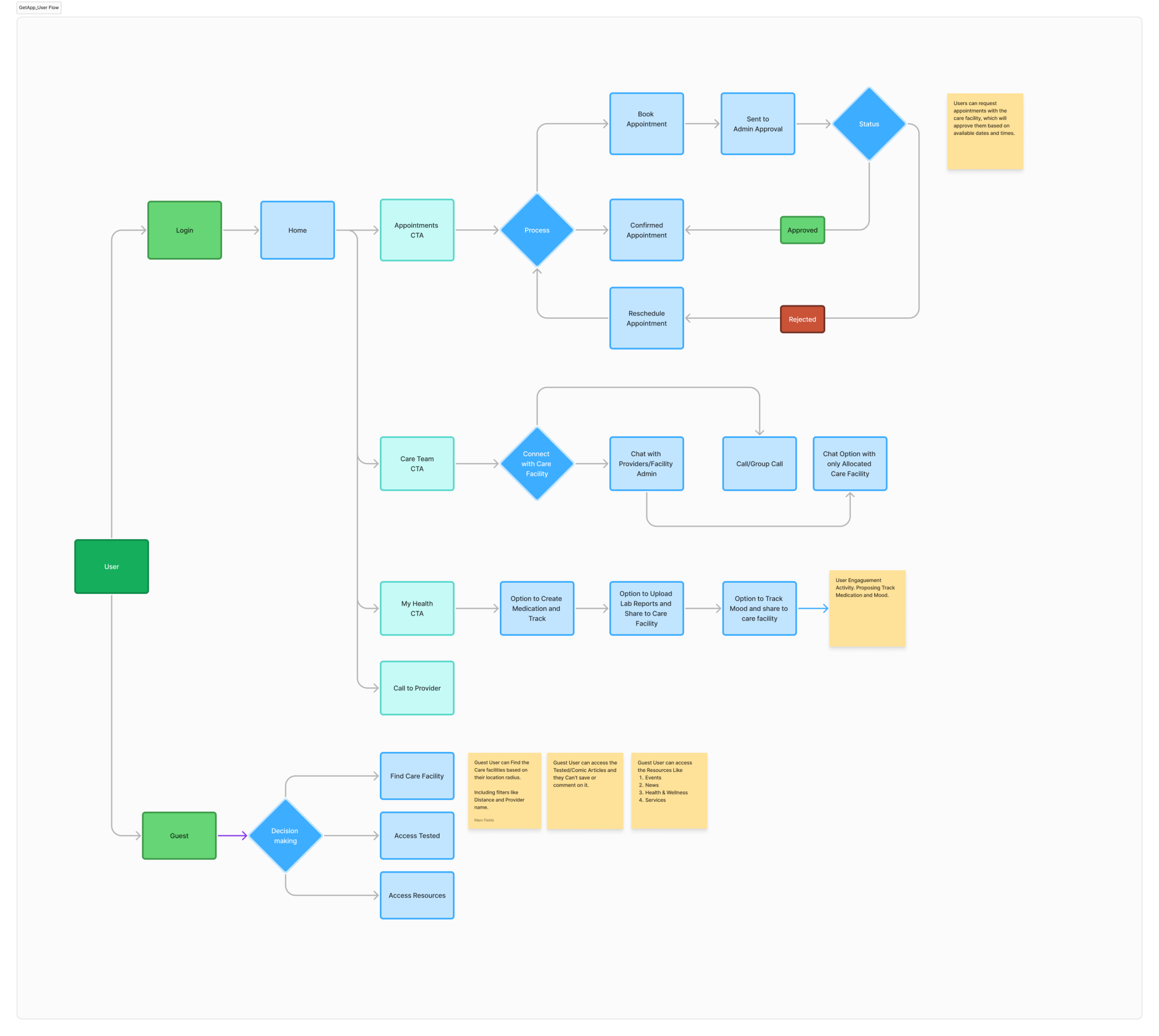 The user flow for Ygetit is designed to create a seamless and emotionally supportive experience across core functionalities Geo locator, mental health tracking, education, events, and Appointments.